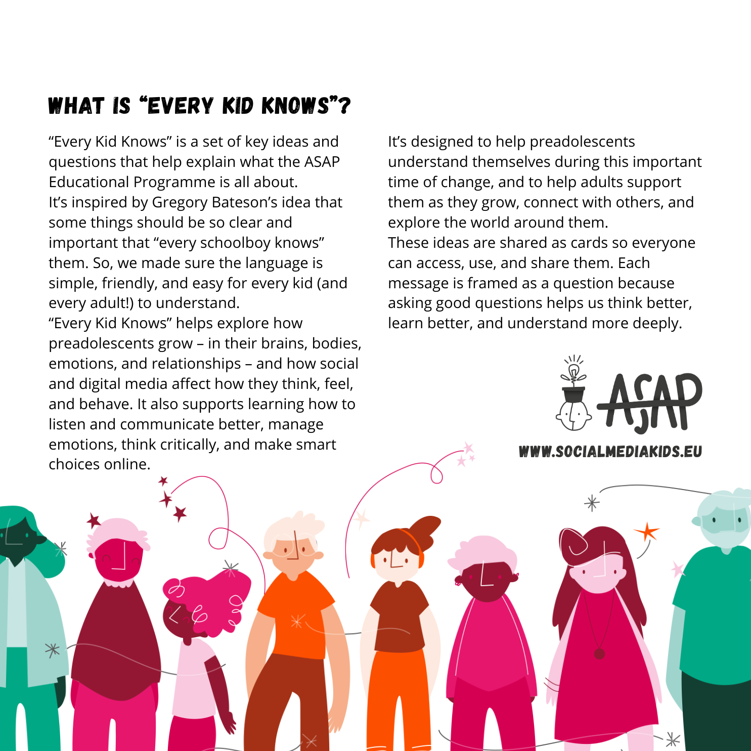 ASAP acknowledges preadolescence – the age “in be-tween” – and targets 11-13 years old kids, assuming that while the borders in a buffer zone cannot be traced with certainty, we can indeed say that its main feature is to be the “age on the edge”. Plus, being a digital native is not just about having technical digital skills.